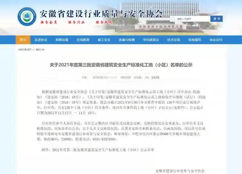 工程建设公司承建项目获评“安徽省建筑安全生产标准化示范工地”