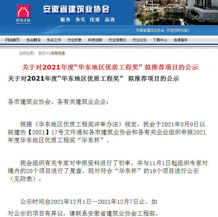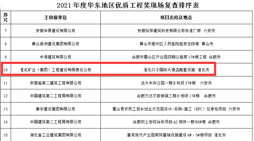 近日,从安徽建筑业协会网站获悉,工程建设公司承建的淮北口子国际大酒店配套设施工程顺利通过了2021年度“华东地区优质工程奖”的评选公示,成功获评“华东杯”奖项。这是该公司第一次荣获此类奖项,为公司创优夺杯开辟了新的渠道。