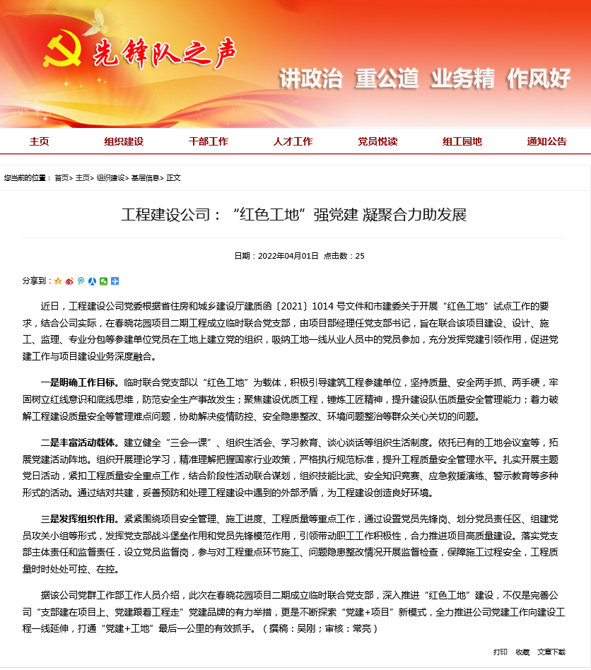 近日,工程建设公司党委根据省住房和城乡建设厅建质函〔2021〕1014 号文件和市建委关于开展“红色工地”试点工作的要求,结合公司实际,在春晓花园项目二期工程成立临时联合党支部,由项目部经理任党支部书记,旨在联合该项目建设、设计、施工、监理、专业分包等参建单位党员在工地上建立党的组织,吸纳工地一线从业人员中的党员参加,充分发挥党建引领作用,促进党建工作与项目建设业务深度融合。