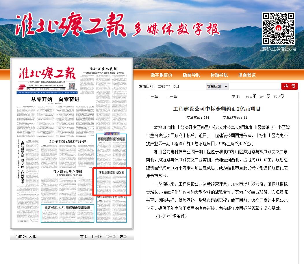 本报讯 继相山经济开发区邻里中心(人才公寓)项目和相山区城镇老旧小区综合整治改造项目顺利中标后,近日,工程建设公司再拔头筹,中标相山区光电科技产业园一期工程设计施工总承包项目,中标金额约4.2亿元。