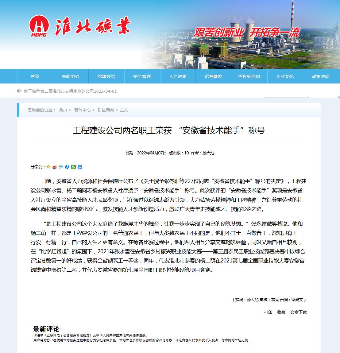日前,安徽省人力资源和社会保障厅公布了《关于授予张冬阳等227位同志“安徽省技术能手”称号的决定》,工程建设公司张永雷、杨二萌同志被安徽省人社厅授予“安徽省技术能手”称号。此次获评的“安徽省技术能手”奖项是安徽省人社厅设立的全省高技能人才表彰奖项,旨在通过以评选表彰为引领,大力弘扬劳模精神和工匠精神,营造尊重劳动的社会风尚和精益求精的敬业风气,激发技能人才创新创造活力,激励广大青年走技能成才、技能报企之路。