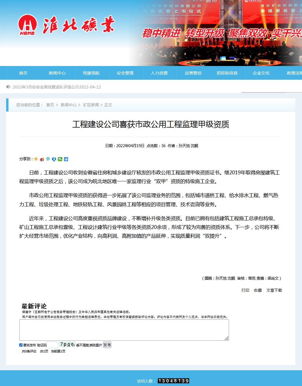 近年来,工程建设公司高度重视资质品牌建设,不断增补升级各类资质。目前已拥有包括建筑工程施工总承包特级、矿山工程施工总承包壹级、工程设计建筑行业甲级等各类资质20余项,形成了较为完善的资质体系。下一步,公司将不断扩大经营市场范围,优化产业结构,向高利润、高附加值的产品延伸,实现质量利润“双提升”。