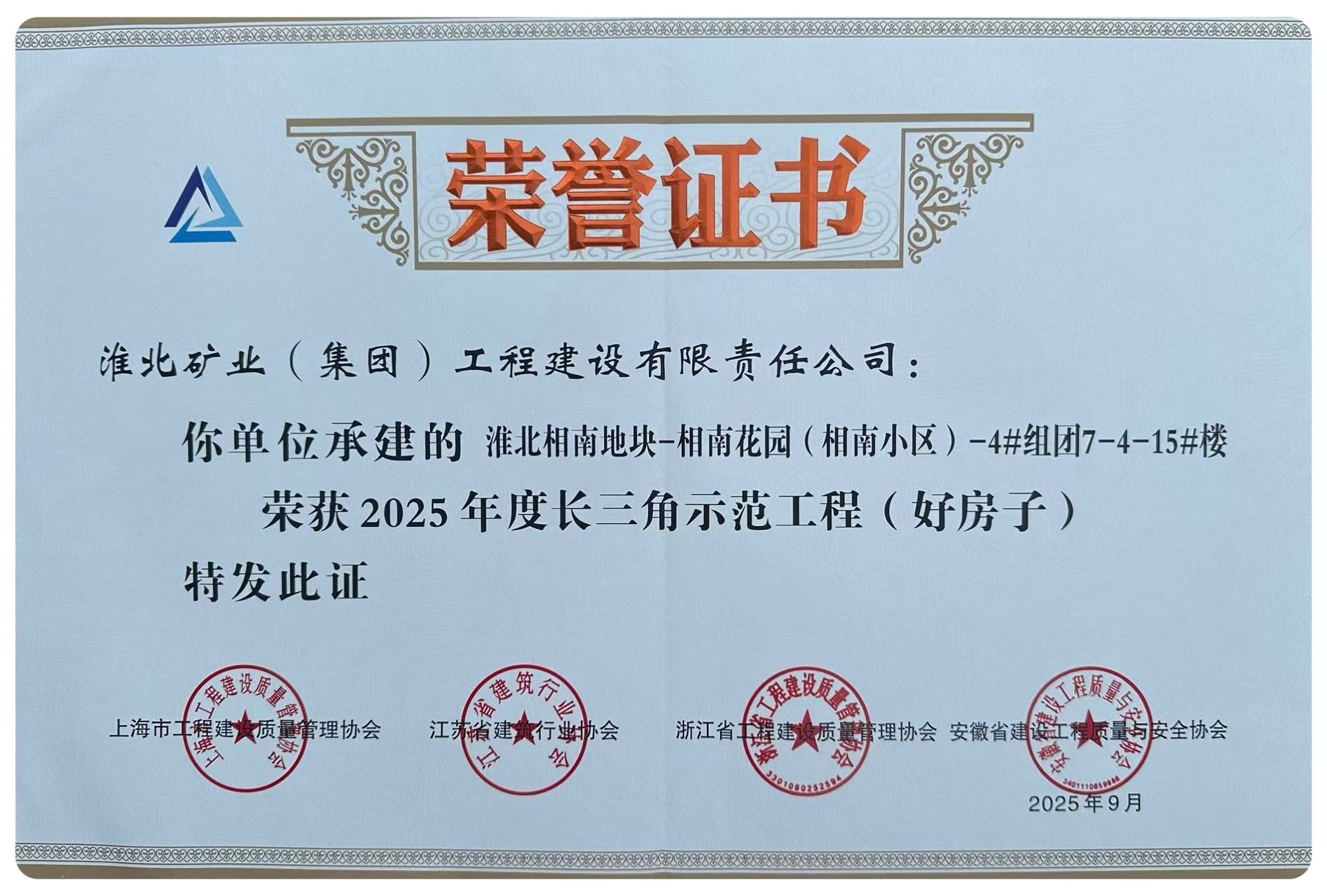近日,由工程建设公司承建的淮北相南地块-相南花园(相南小区)-4#组团7-4-15#楼项目荣获2025年度“长三角示范工程(好房子)”称号,成为安徽省唯一获评该项称号的住宅项目,并作为安徽省好房子建设代表作经验交流发言。