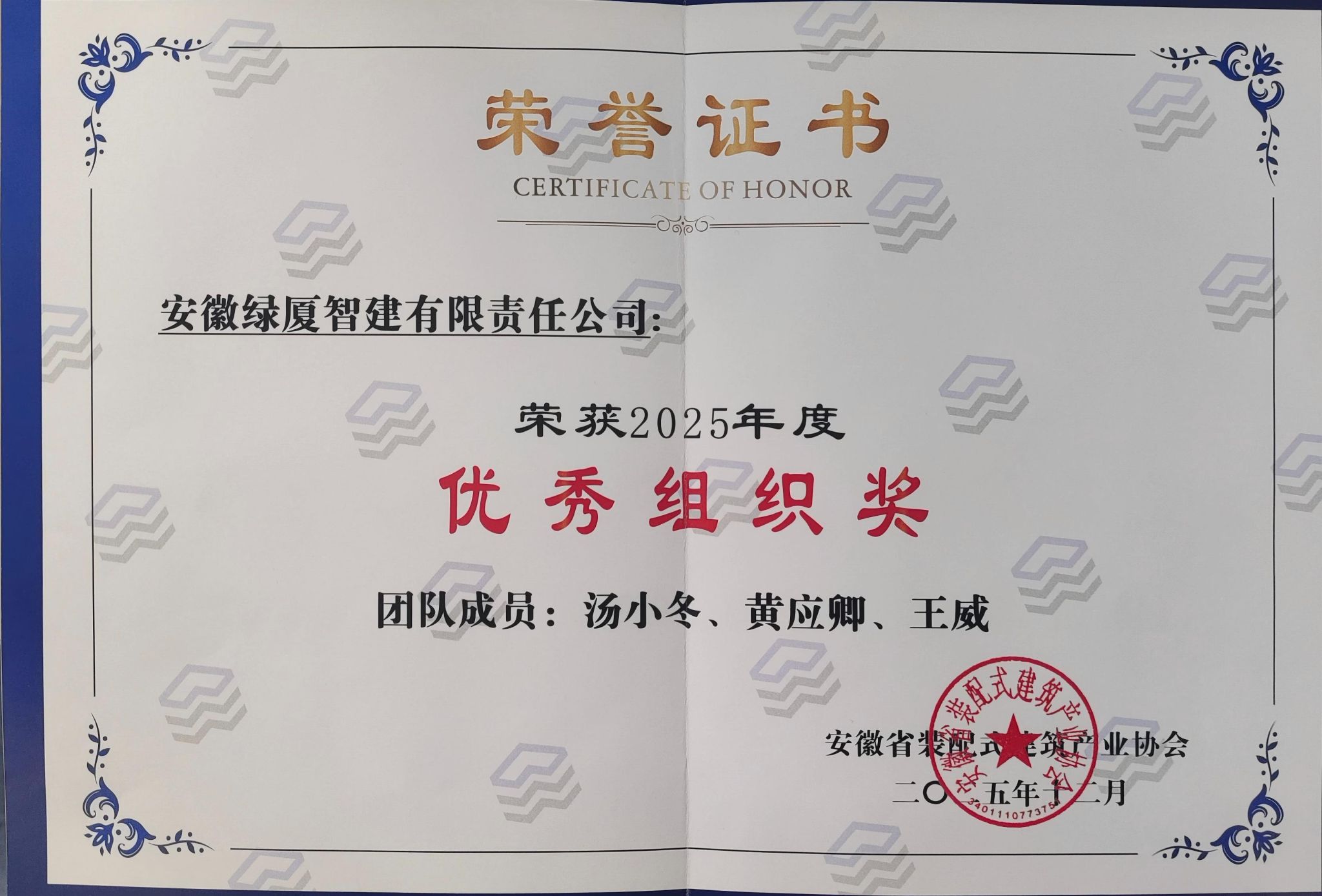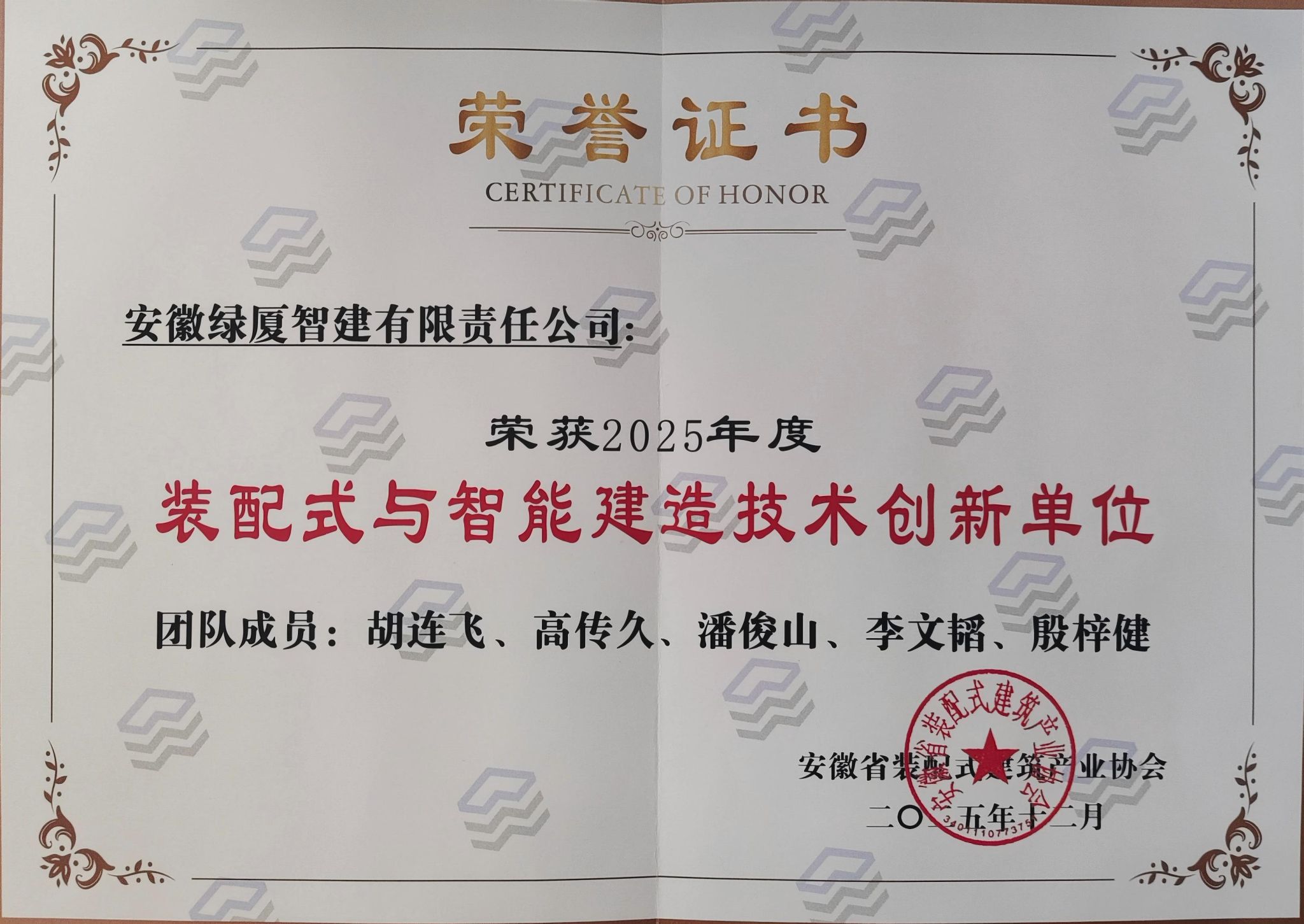 日前,安徽省装配式建筑产业协会公布2025年度评优结果。绿厦智建公司荣获“2025年度装配式与智能建造技术创新单位”和“2025年度优秀组织单位”两项称号;朱应江同志被评为“装配式建筑技术推广先进个人”。
